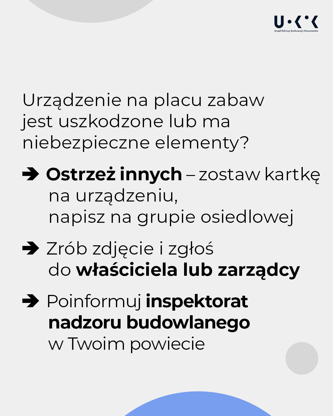 Wejdź na stronę placezabaw.uokik.gov.pl i sprawdź, jak powinien wyglądać bezpieczny plac zabaw. Przygotowaliśmy poradniki dla rodziców i opiekunów oraz właścicieli i osób zarządzających placami zabaw.