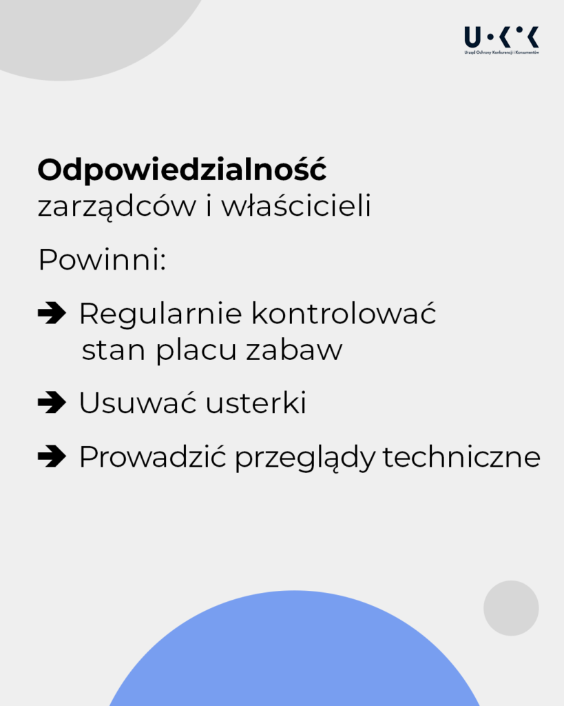- Za bezpieczeństwo placu zabaw odpowiada jego właściciel lub zarządca. Rodzice i opiekunowie także muszą być czujni.