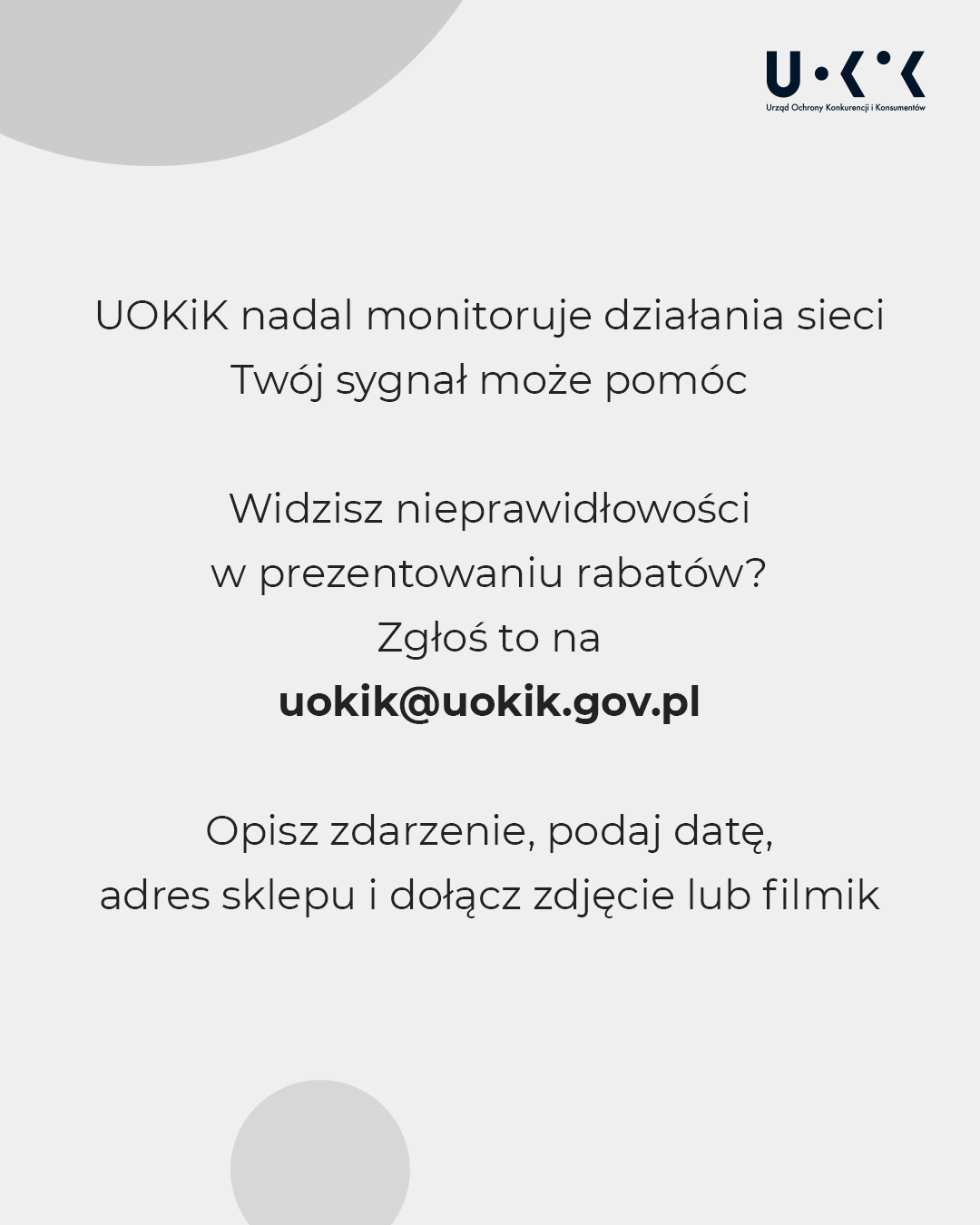 - Widzisz nieprawidłowości? Poinformuj nas na: uokik@uokik.gov.pl. Opisz zdarzenie, pomocne może być też zdjęcie lub film.